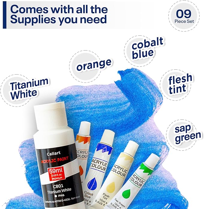 - Comprehensive 9-Piece Acrylic Painting Kit: Our painting kit includes all the materials needed to bring your creativity to life. High-quality acrylic paints, a durable paint palette, a set of brushes, graphite paper, and a canvas panel. Use the exact same materials as the instructor for a seamless, enjoyable painting experience from start to finish.