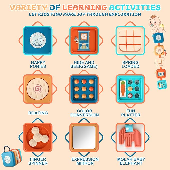 - ❤【SENSORY TOYS】: This sensory toy has many different activities that help develop fine motor skills, like grasping, pulling, spinning and pressing different textures. Through different textures and color contrasts, it comprehensively stimulates infants and toddlers' Stimulates infants and toddlers' tactile/auditory/visual development through different textures and color contrasts.Montessori toys for 1 year old promotes the development of hand-eye coordination, which is especially helpful for children with Autism or ADHD.