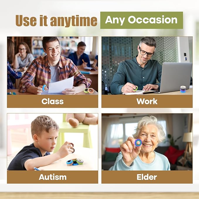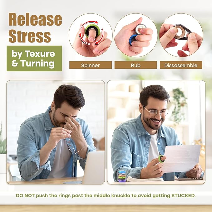 - New Design for Adults Anxiety: Unlike the bright neon colors suitable for kids, we have launched this spinner rings in mature, neutral colors that are more adult-friendly. By continuously spinning these silent fidget rings on your fingertips, they keep your hands and mind busy during work and meetings. Great office desk sensory fidgets for adults stress relief and Anti-anxiety