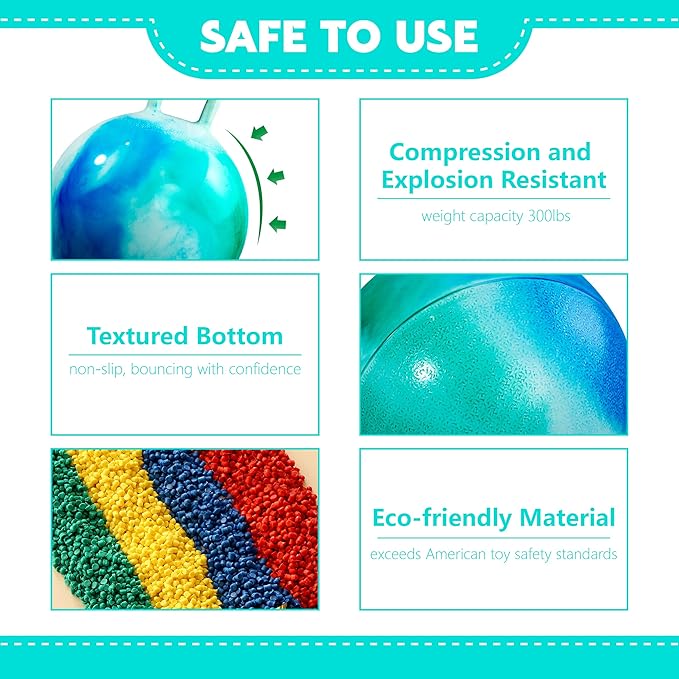 - ✅ 【Safe Important】:Our bouncing ball with handle constructed with ultra-thick PVC material to withstand vigorous adult bouncing, exercising and fitness routines. Adult or teens maintain perfect stability whether bouncing or sitting on this jumping ball with handle - no wobbles, just safe fun!