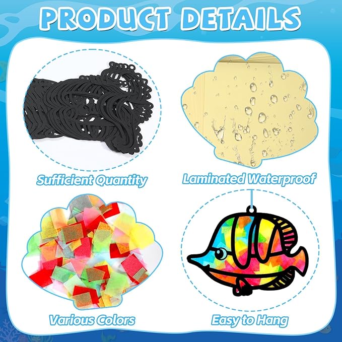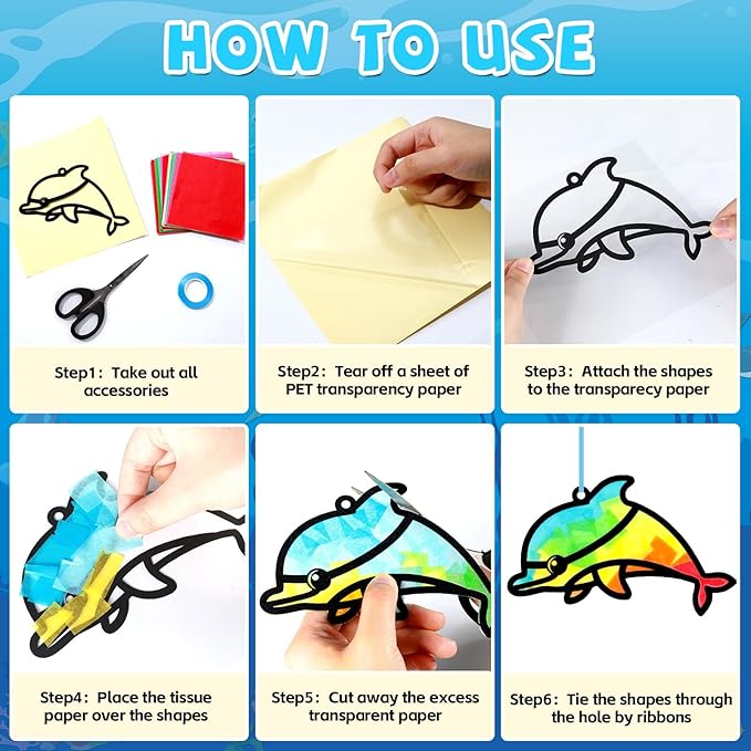 - Easy to operate: Trim the tissue paper to your desired shapes, peel off the backing from the PVC sheet, and apply the template. Stick the colorful tissue paper on top and trim the excess PVC along the edges. The pre-cut hole makes it easy to hang your sea animal tissue paper arts crafts on wall, door, or window with the ribbons. This DIY under the sea window suncatcher crafts for kids will bring a pop of color and joy to your space.
