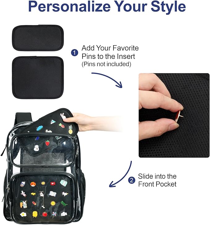 - [Show Off Your Unique Style] Not just for school, this clear backpack also includes two insert boards in the front pockets for displaying your favorite pins, badges, and decorations. Perfect for students who want to stand out while staying compliant with school guidelines. Express your creativity with confidence!