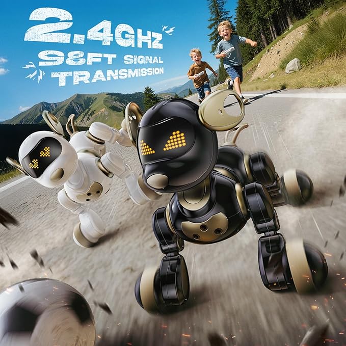 - 【Control the Fun, Your Way】Whether your child is across the room or right beside their pup, control is always at their fingertips! With a powerful 2.4GHz remote (up to 98ft!), they can direct their dog to walk, turn, bark, or perform tricks. Or, simply touch its head to activate fun sounds and gestures. Perfect for living room races or backyard adventures!