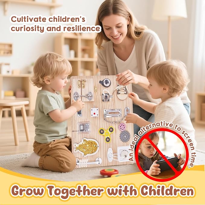 - [ Educational Busy Board ] The wooden toddler busy board features a variety of engaging activities. Kids can learn basic life skills and cognitive concepts while playing, boosting their hand-eye coordination, fine motor skills, and thinking abilities. It's an ideal alternative to screen time.