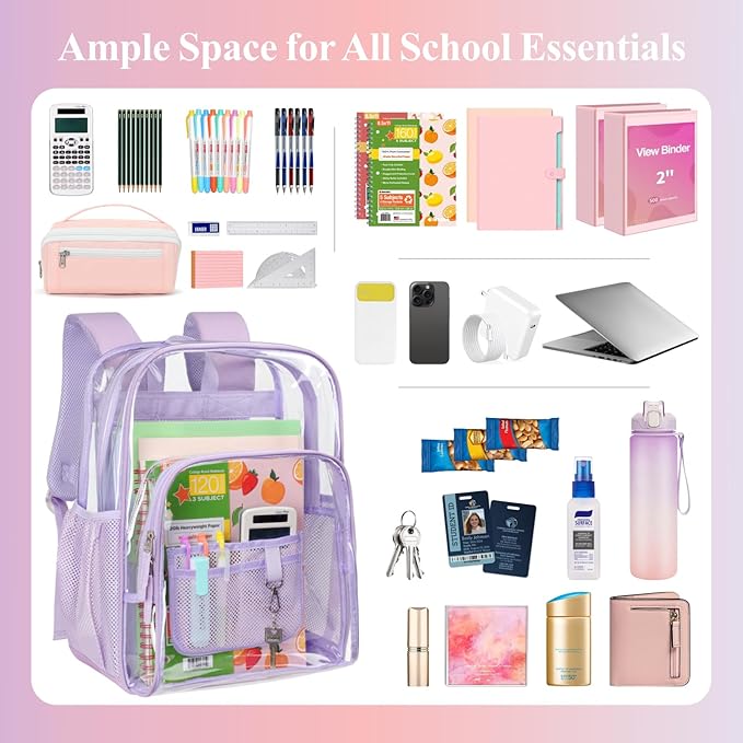 - Spacious and Organized: This large clear backpack measures 12.6" x 6.7" x 17.1", offering ample space for binders, laptop, notebooks, and more. With 1 main compartment, 1 front zipper pocket with mesh slots, and 2 side pockets for a water bottle and umbrella, it keeps your school essentials neatly organized and easily accessible