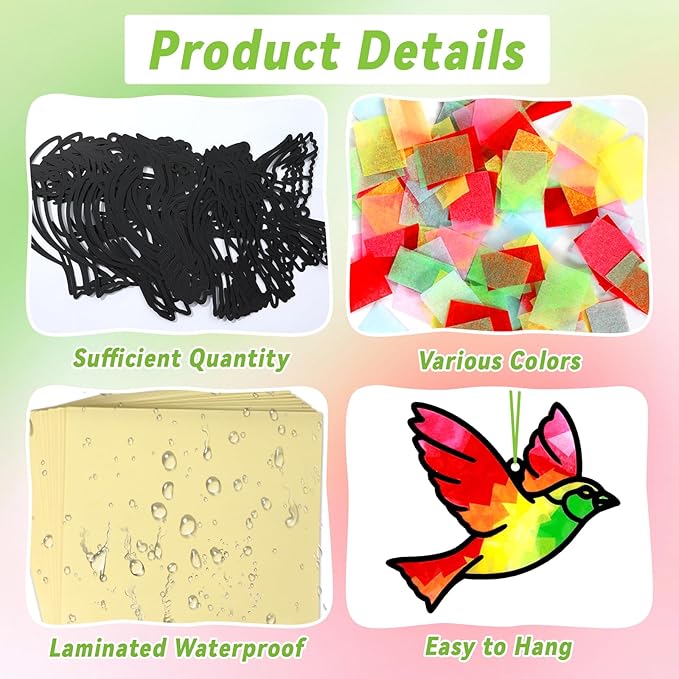 - Easy to operate: Trim the tissue paper to your desired shapes, peel off the backing from the PVC sheet, and apply the template. Stick the colorful tissue paper on top and trim the excess PVC along the edges. The pre-cut hole makes it easy to hang your bird tissue paper arts crafts on wall, door, or window with the ribbons. This DIY bird window suncatcher crafts for kids will bring a pop of color and joy to your space.