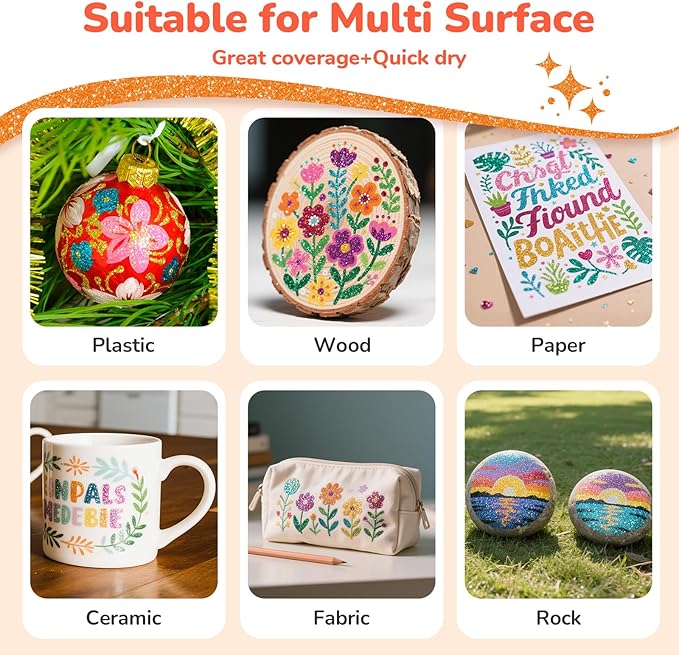 - 【12 CURATED GLITTER HUES | EYE-CATCHING SPARKLE】 From bold Red to soft Pink, each shade features intense glitter particles optimized for maximum shimmer on dark & light surfaces. No chalky finishes – just rich, opaque metallics that pop on wood, glass, and black paper.