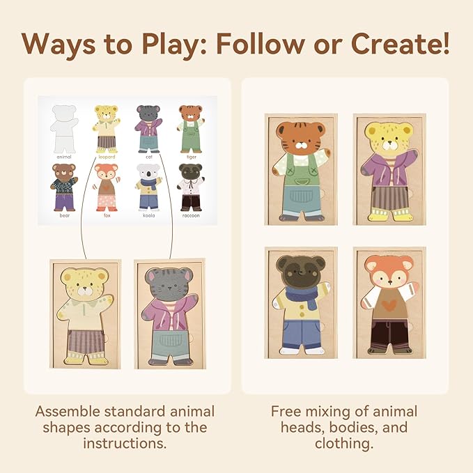 - Engaging Play & Creativity: This toddler puzzles brings dual - mode fun. Kids can either follow the instruction manual to assemble matching puzzles precisely or freely mix - and - match animal shapes and outfits, just like a creative dress - up game. It not only hones hands - on skills but also fuels imagination, offering lasting play value to keep children entertained for extended periods