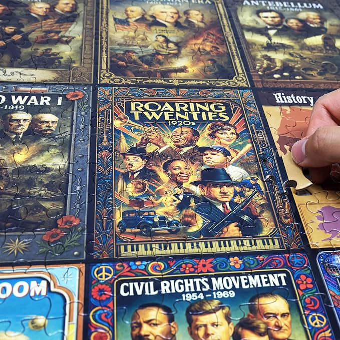 - 【A JOURNEY THROUGH AMERICAN HISTORY】 - Piece together the story of the United States, from the Revolutionary War to the 21st Century! This captivating vibrant colorful puzzle provides a visual timeline of America's most pivotal moments and influential figures. Collection of Stunning Posters of Historic Eras of America including: Revolutionary War, Jeffersonian, Antebellum, Civil War, Gilded Age, Progressive Era, Word War I, Roaring Twenties, The Great Depression, World War II, Post War Boom, Civil Rights Movement, Late Cold War, Post Cold War, 21st Century and more.