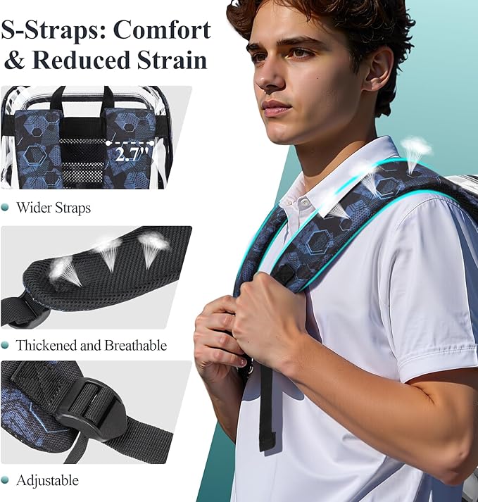 - Comfortable for All-Day Carry: Thick, padded shoulder straps are ergonomically designed to reduce strain—perfect for students 12+ using this clear bookbag. Carry a full load comfortably, whether it’s for school, sports, or travel
