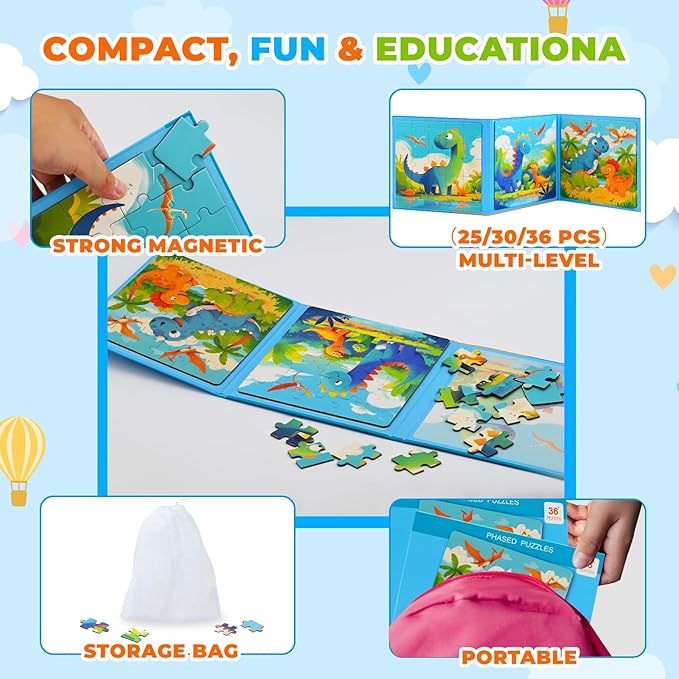 - Dinosaur Puzzles for Kids Ages 3-5: Introduce 3 skill-building magnetic Jigsaw puzzles (25/30/36 pieces) with escalating difficulty. Includes storage bag + 3 dinosaur scenes (T-Rex, Stegosaurus & more). Each completed magnetic puzzle measures 6.9"x6.9", offering a fun challenge perfect for little dinosaur lovers.