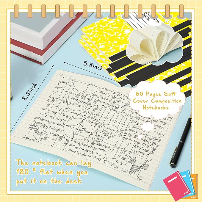 - Wide Ruled Sheets: each college ruled composition notebook contains A5 8.2 x 5.5 inch wide ruled sheets, notebook Include 60 pages to help you keep your notes organized, the quality paper of these composition notebook handles mechanical pencils, gel pens, ink pens and highlighters and won't bleed ink, so you will have a wonderful experience