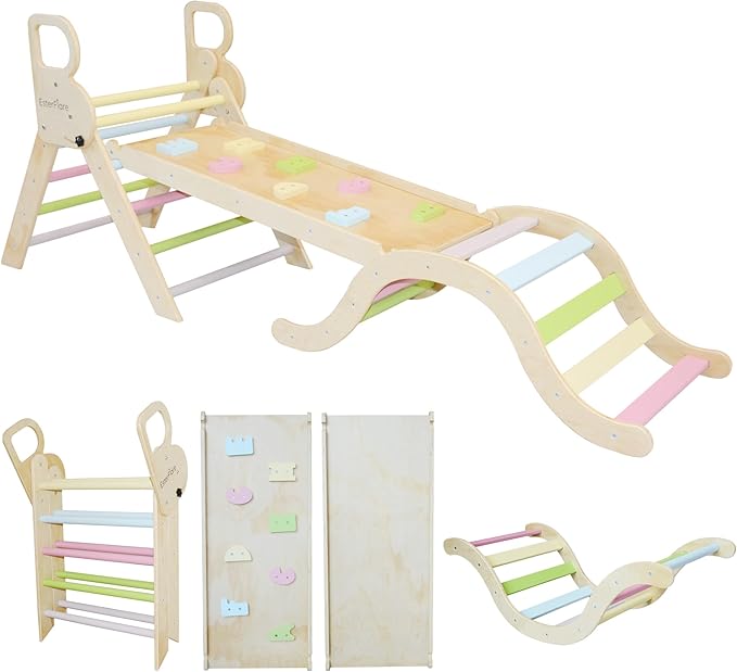- 7-in-1 Montessori Toddler Pikler Climbing Set : This versatile climbing set combines a ladder, arch climber, and rock climbing imitation, all in one space-saving design. It promotes physical fitness, balance, and hand-foot coordination while enhancing family bonding. The perfect gift for toddlers, baby and kids.