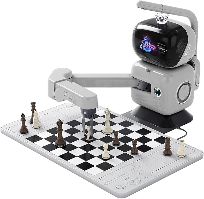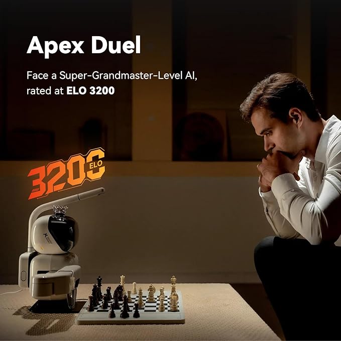 - Precision Robotics: Three-DOF arm places real pieces with approx 1 mm accuracy; natural eight-second move cadence keeps play safe, controlled and immersive; gentle recovery if a piece tips.