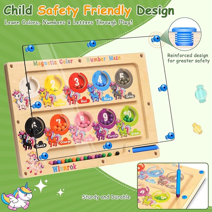 - Explore Colors and Counting: The magnetic toddler game features 55 magnetic beads in 10 distinct colors, with "Unicorn" representing numbers 1-10. Great for improving fine motor skills and learning colors and numbers. Wooden magnetic board maze allows children to learn 3 skills number, counting, and color matching keeping them fun and focused for aged 3-5 toddlers kids