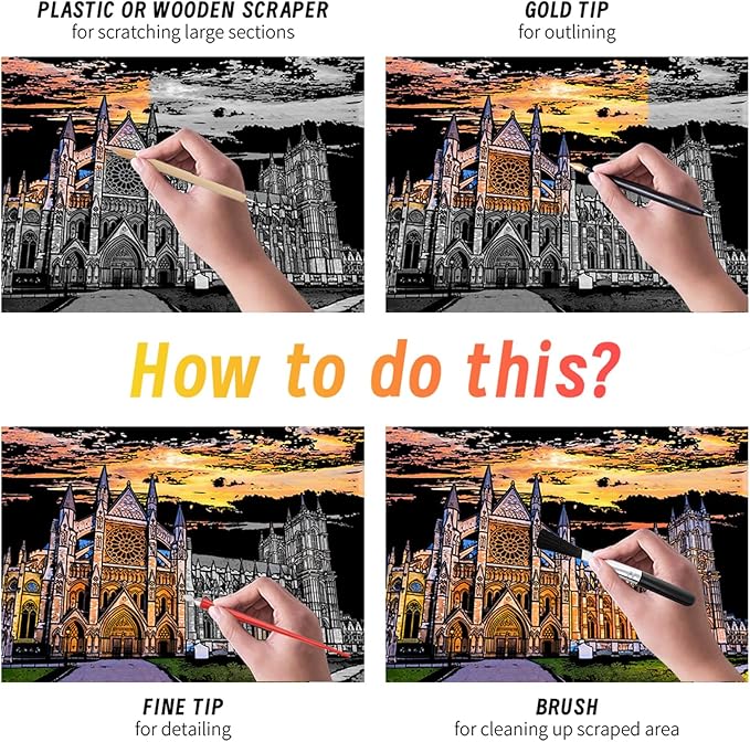 - 【5. New World Landmark Collections (Ongoing Series)】We continuously release new designs featuring global landmarks. Travel the world through scratch art without leaving home, completing a unique creative journey. Each finished artwork commemorates your personal artistic exploration.Ideal Gifting: Perfect for birthdays, holidays, teachers, or art enthusiasts—a thoughtful gift that stands out.