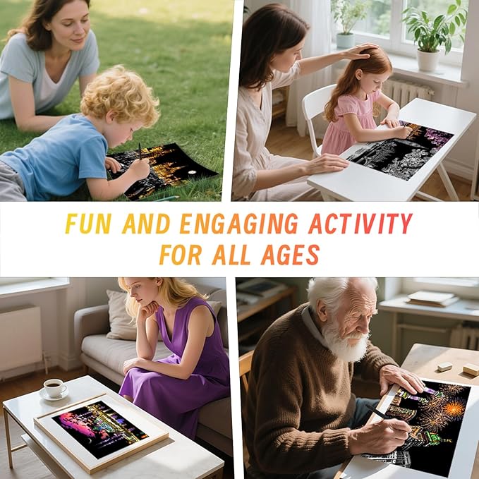 - 【3. Create Cherished Memories Together】Unveil surprises side by side with your family! As you scrape away the matte layer together, a vibrant cityscape comes to life before your eyes. Pre-printed templates guide hands of all sizes to effortlessly reveal dazzling colors using the included tools. This zero-threshold design ensures fun for the whole family: sparking children's boundless creativity while reigniting parents' artistic passion—crafting heartwarming memories hand in hand.