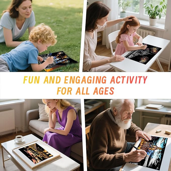 - 【3. Create Precious Memories Together】Unveil surprises side by side with your family! As you scrape away the matte layer together, a vibrant cityscape comes to life before your eyes. Pre-printed templates guide hands of all sizes to effortlessly reveal dazzling colors using the included tools. Zero-threshold design ensures fun for the whole family: spark endless creativity, reignite parents' artistic passion—and craft heartwarming memories hand in hand.