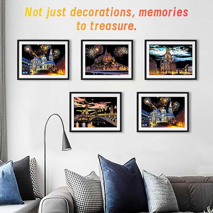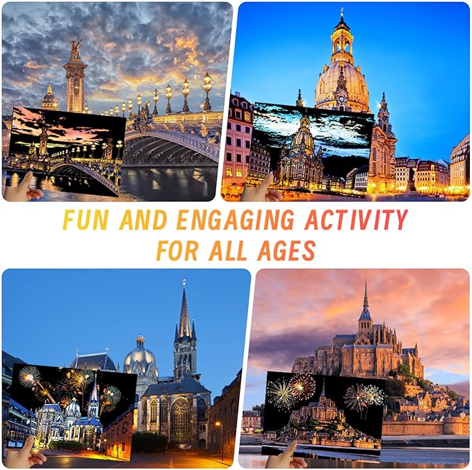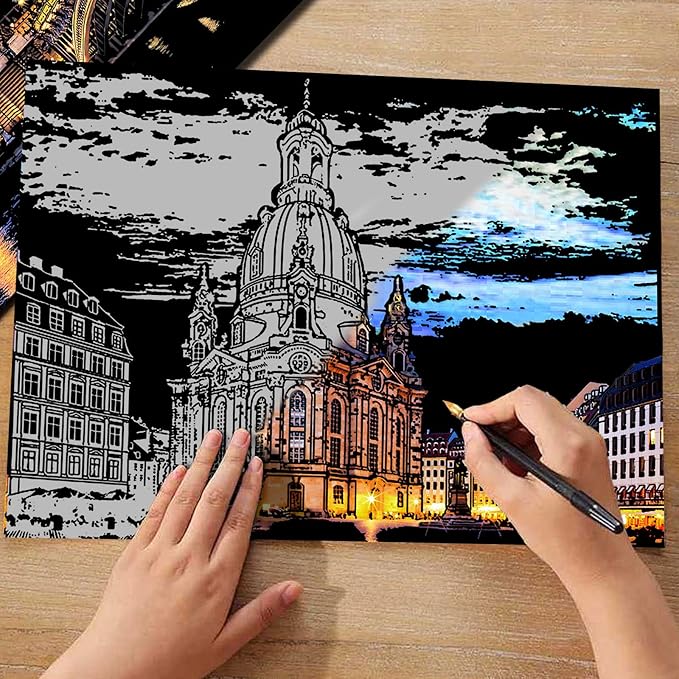 - 【4. Gallery-Worthy Art Pieces】Inspired by real cityscapes, each scratch art reveals astonishingly realistic details. Relive memorable journeys through creation! Every finished masterpiece becomes instant wall decor—elegant framed art or heartfelt handmade gifts, making every piece a treasured keepsake.