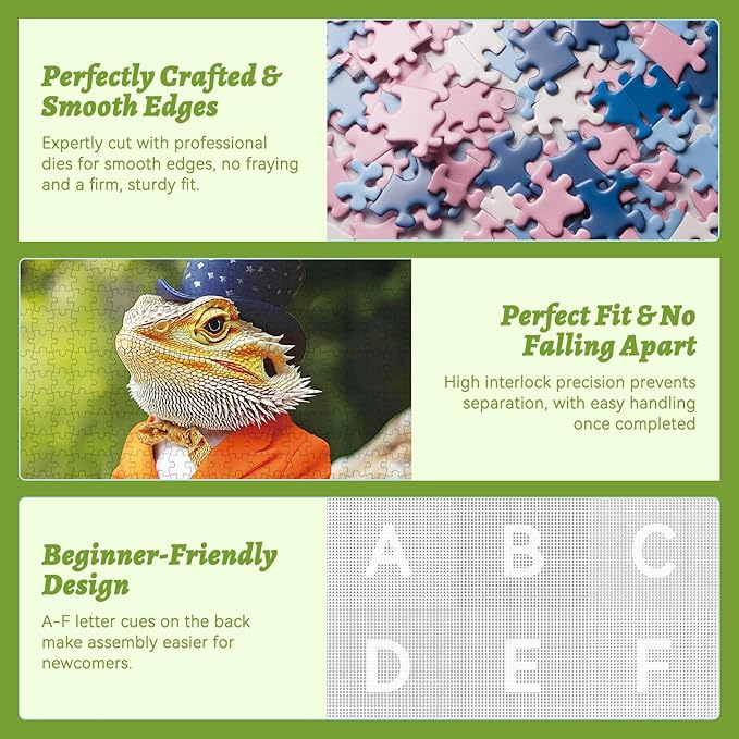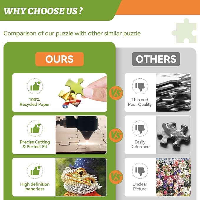 - High Quality Eco-Friendly Materials: Our 300 piece puzzles for adults are made from durable, eco-friendly cardboard. Enjoy a smooth, premium puzzle experience with Mr. Lizard dining on a fresh vegetable salad.