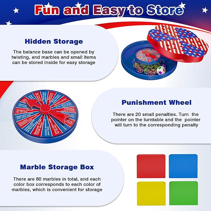 - Complete Party Game Set for Endless Fun:Set includes 80 vibrant marbles (red, green, blue, yellow), 1 wobble board, 1 spinner wheel, 1 dice, a safety fence, and challenge punishment cards for extra excitement. All-in-one party game for kids ages 6-12 and beyond!