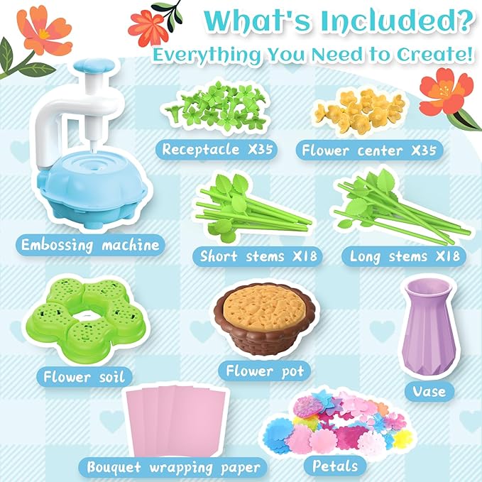 - DIY Flower Set: The Kufanda DIY Flower Bouquet Toy Set includes 1 embossing machine, 108 petals in various colors, shapes, and materials, 36 flower centers, 36 receptacle, 18 long stems, 18 short stems, as well as a vase, flower soil, flowerpot, and 4 floral wrapping papers.