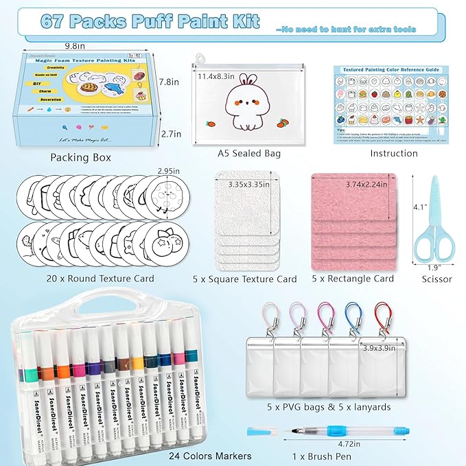 SanerDirect 67 Pack Magic Puffy Paint Kit, Foam Texture Painting with 30Pcs 3D Foam Art Paper & 24-Colored Markers, DIY Creative Craft Set for Kids