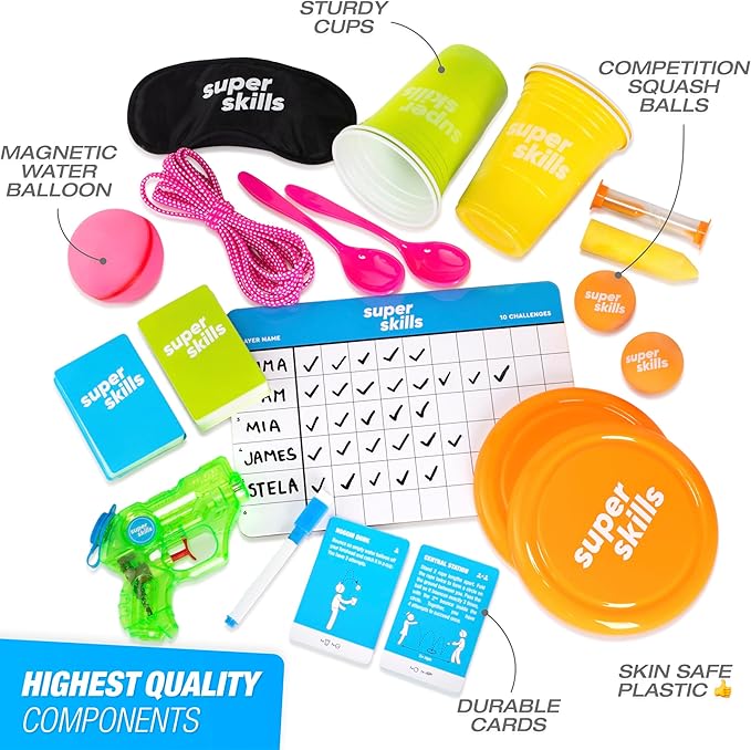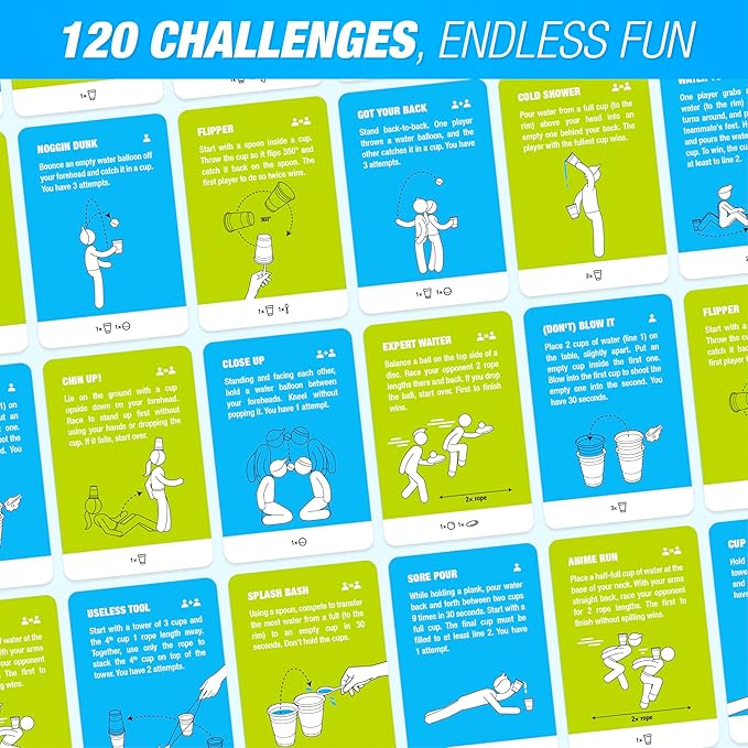 - Everything you need comes with the game – 120 challenge cards, 2 flying discs, 2 spoons, 2 balls, water gun, reusable water balloon, elastic rope, blindfold, chalk, sand timer, scoreboard & marker. Just add water.