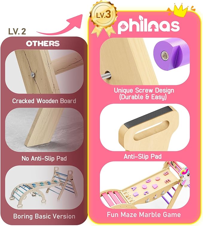 - Perfect Present & Trusted Support: Give a gift that grows with them! This wooden climbing set for toddlers is perfect for kids ages 2-5/3-6, great for birthdays or holidays. Backed by Philnas after-sales support you can trust—reach out to us anytime