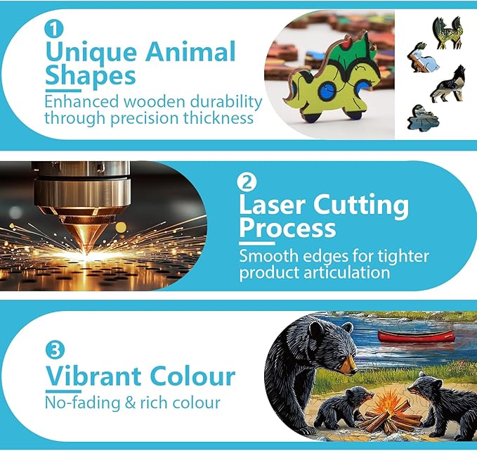 - Bears and Nature Wooden Puzzle: This wooden bears and nature puzzle includes 300pcs irregular patterns. It is estimated that the assembly will take 3 hours, and you can get a beautiful finished bears and nature puzzle with an expanded size of 38.5x28.5cm/15.1x11.22inch.