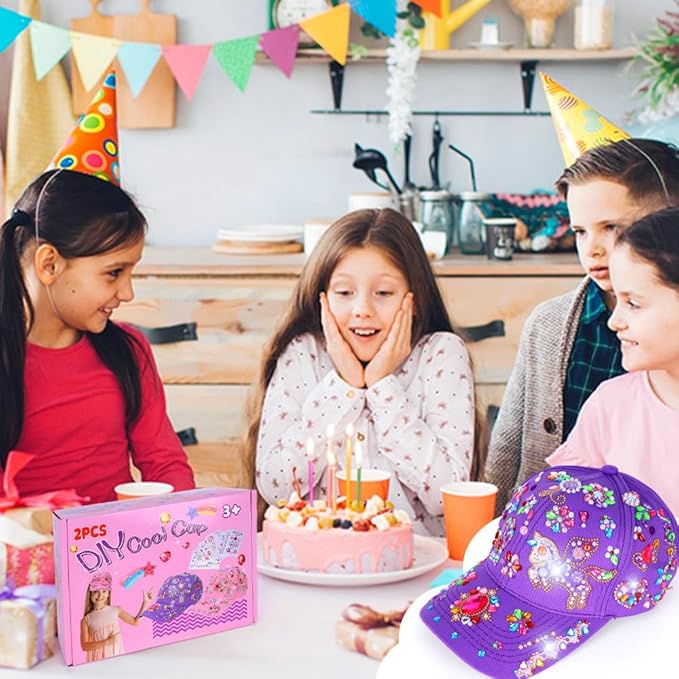 - 🧢Girls Gift Idea-DIY Baseball Cap Set🧢 If you are looking for gift suitable for kids, this DIY baseball cap set will be your first chioce! The package include 2 Pcs solid baseball cap, one cap is pink and the other is purple. There are also 8 sheets of crystal diamond Stickers included. Kids can decorate baseball cap on thier own opinion! Which is Suitable for wearing at parties, travel and outdoor activities, let kids become eye-catching "stars".