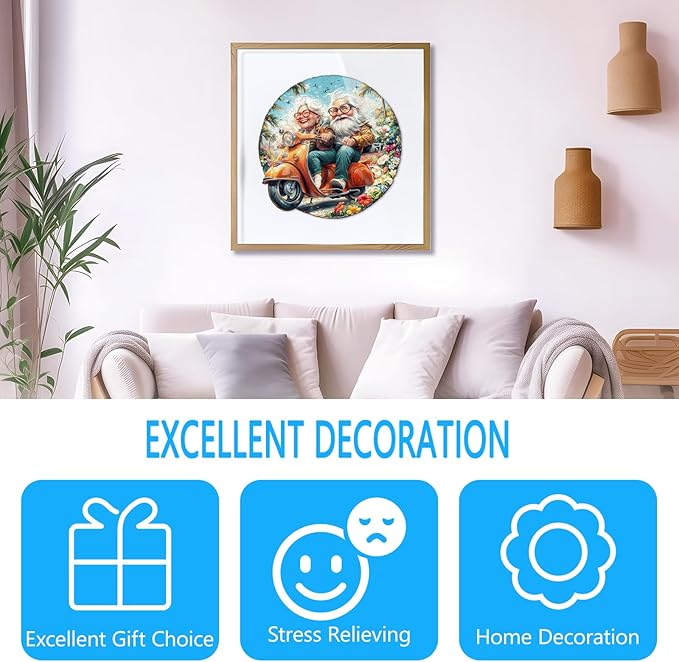 - ๐Motorcycle Granny Themed Puzzle - This wooden puzzle shows an elderly couple riding an orange scooter, surrounded by colorful flowers and palm trees. They both wear glasses and are smiling happily, enjoying their ride in a vibrant, tropical setting. Let's explore the fun of wooden toys together.