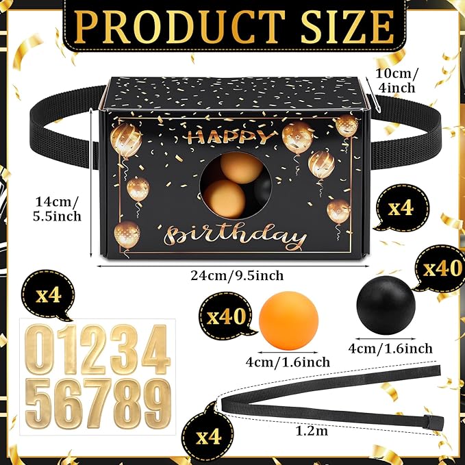 - Package Includes: our swing shaking balls game includes 4 shake boxes, 4 belts, and 80 balls in black and orange colors, and 4 gold plated number stickers for your DIY age; The shake box measures about 9.5 x 5.5 x 4 inches/ 24 x 14 x 10 cm, and the ball diameter is about 1.6 inches/ 4 cm, providing a fun and exciting game for birthday parties
