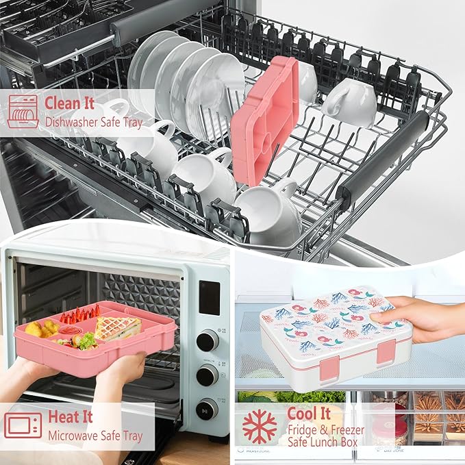 - No Mess, Just Yum! – Say goodbye to leaks and lunchtime chaos! This kid-friendly lunch box has a silicone seal to keep everything locked in tight. With six compartments—including one for utensils, one for sauces, and four for sandwiches, salad, pasta, fruit or snacks—it’s easy to pack a colorful, balanced meal your little one enjoy it.