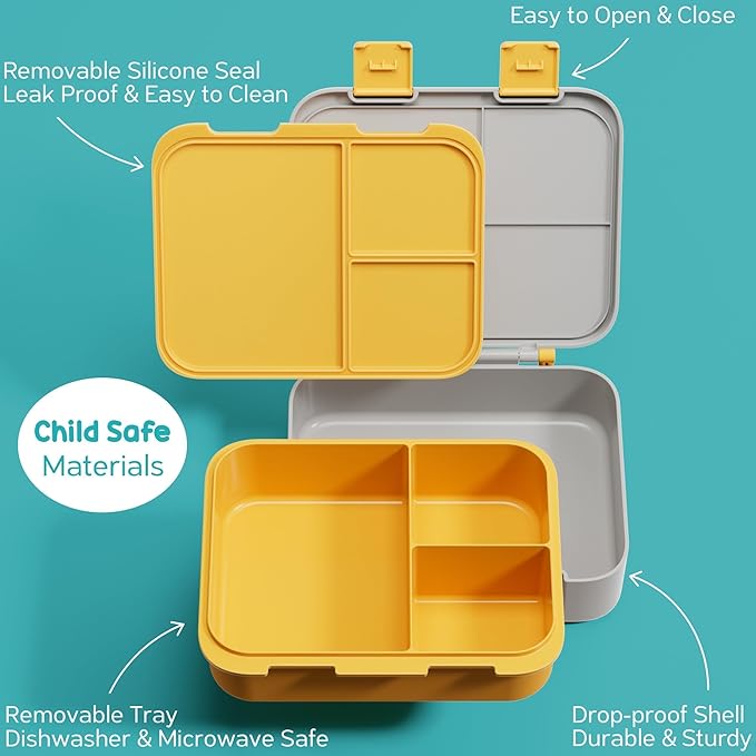 - EXCELLENT KIDS BENTO LUNCH BOX: Fimibuke lunch snack container features 3 compartments perfectly sized for separated mains, fruits & snacks - no crowding or flavor mixing! An extra sauce jar for yogurt, houmous, and dips. Upgraded reinforced latches and removable silicone seals guarantee 100% leakproof performance! No more messy spill even upside down in backpacks! The food tray is microwave safe while the sauce jar, removable lid & tray are top rack dishwasher safe ( under 80℃) & freezer safe