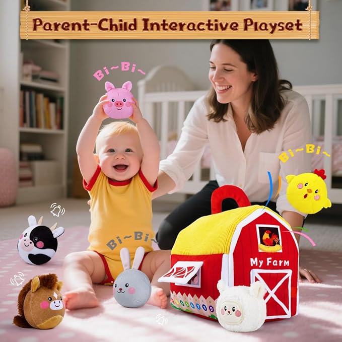 - CUTE FARM ANIMAL SET: This adorable farm playset includes a soft barn and 6 plush animals: pig, cow, chicken, rabbit, sheep, and horse. Designed for tiny hands, the lightweight animals encourage imaginative play. Perfect for developing motor skills and sensory exploration during tummy time or playtime, ensuring your baby hours of fun.