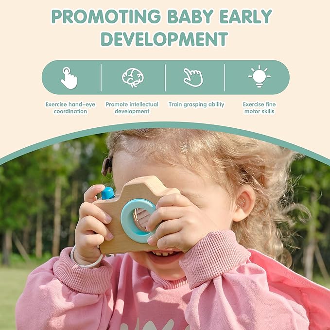 - Multi-dimensional exploration: The creative camera kaleidoscope toy allows young children to see many interesting perspectives through the prism and stimulate their imagination. The wooden key rattle has soft colors and soft sounds through the rattle, which is suitable for young children's keen hearing. The wooden rotating drum toy can develop the baby's motor skills and exercise the finger grasping ability. The wooden rattle makes a soothing sound without harsh noise.