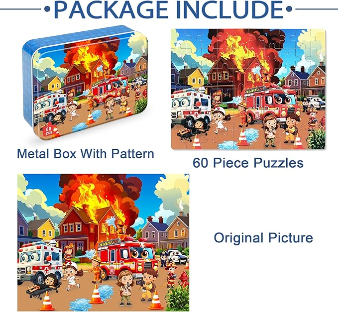 LELEMON Puzzles for Kids Ages 4-6, Fire Fighting 60 Piece Puzzles for Kids Ages 3-5 in a Metal Box, Educational Jigsaw Puzzles Childrens Puzzle Games Puzzle Toys for Girls and Boys