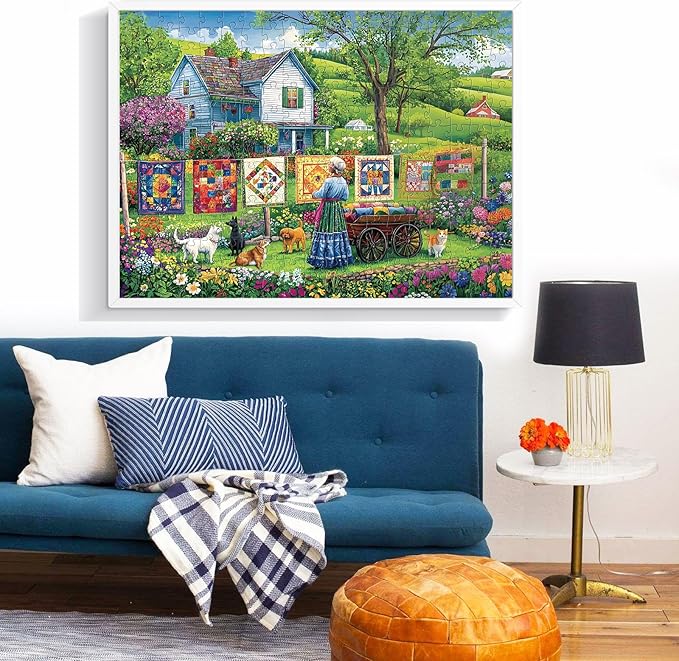 - Country Quilt Farmhouse Puzzle --- Wrap yourself in the warmth of country charm with our Country Quilt Farmhouse Puzzle. ๐ก๐ผ๐งบ This 300-piece puzzle features a colorful quilt fluttering on a clothesline in front of a classic white farmhouse, surrounded by green fields and blooming flowers โ a peaceful tribute to simpler times and cozy countryside living.