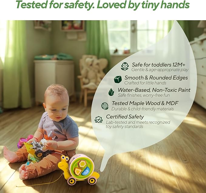 - SAFE & CERTIFIED – CPC certified and crafted from smooth natural wood, painted with non-toxic, water-based paints. Designed for ages 12M+. Snaily’s Journey was made with little explorers in mind—from her gentle wheels to her happy drum that spins as she rolls. Even her pull string follows U.S. child-safety guidelines (~12 inches), just the right length to keep toddlers safe while letting their imagination roam free. Because even magic needs gentle limits.