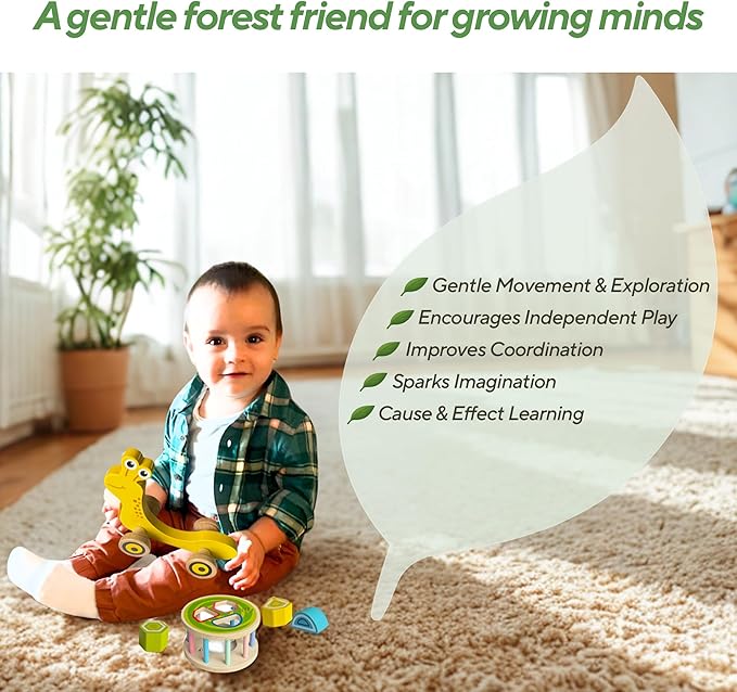 - PULL, PUSH & 2-IN-1 SHAPE SORTER DRUM - Snaily's Journey moves with a safe pull string or gentle push, and as she rolls, her drum spins with a cheerful rhythm. The removable drum doubles as a shape sorter with 3 wooden figures and matching cutouts for magical discovery - making this toy 2-in-1 fun.