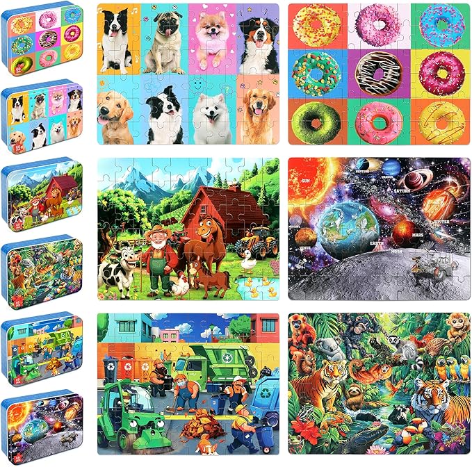 - 🧩【PUZZLES FOR KIDS WITH METAL STORAGE BOX】 Kids jigsaw puzzles ages 4-8/puzzle for 6 year old come with a metal tin box which is very convenient to store and takes for travel. The pieces of kids puzzles ages 3-5 will not be lost as well.Kids enjoy doing puzzle game and form good habits of integrating things.The finished puzzle measures 9.5x6x0.12 inches. Also we provide a full-Size picture guide in package and the picture of kids puzzles ages 6-8/puzzles for 5 year old boys is clear and vibrant