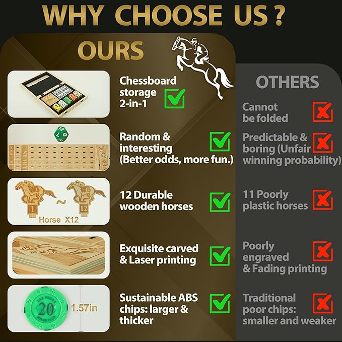 - IDEAL HORSE GIFTS: This horse race board game set includes a foldable solid wood board, 12 wooden horses, 2 dice (1 backup), 100 chips, 2 decks of cards and instructions, all neatly packed in a compact and reliable box. A unique horse gift for horse lovers, family and friends.