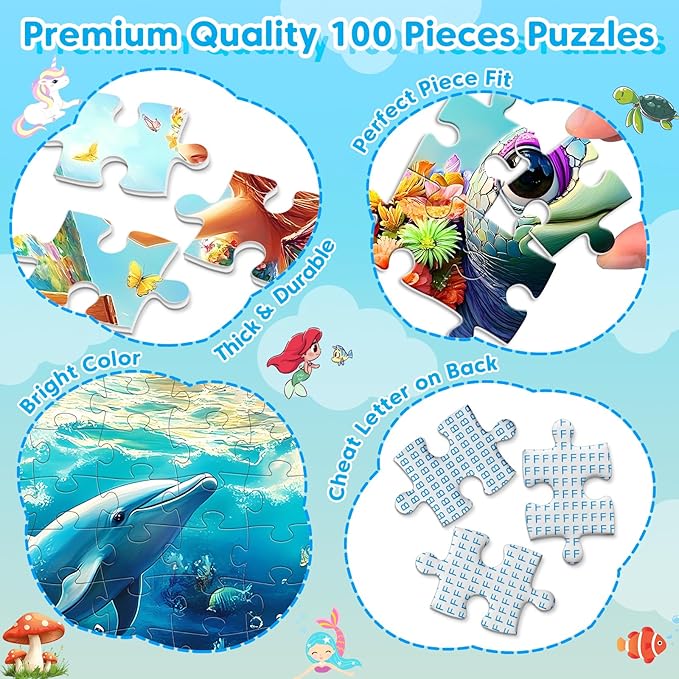 - 4-Pack 100 Piece Puzzles for Kids Ages 4-8: This BraniacBits puzzle set includes four exciting themed puzzles: Mermaid Unicorn, Butterfly Fairy, Cute Turtle, and Mushroom Cottage. Each puzzle features vibrant colors that provide an engaging visual experience while assembling. Perfect for puzzles for kids ages 4-6, puzzles for kids ages 6-8, and puzzles for kids ages 8-10, offering fun and educational play for boys and girls