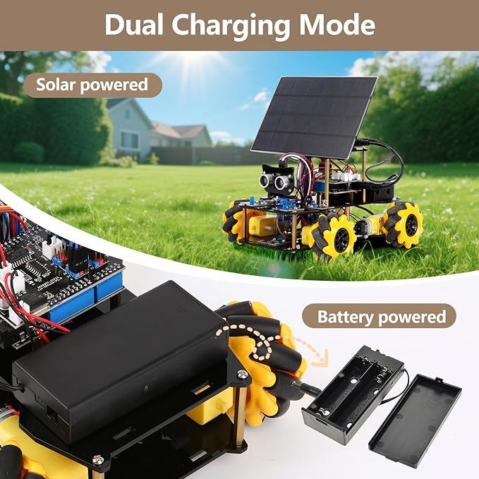- Dual Power System for Indoor & Outdoor Play. The STEM robot supports solar charging and battery-powered options, so kids can enjoy uninterrupted learning indoors or in the yard. No need to worry about cloudy days—switch seamlessly between power sources for maximum flexibility and fun.
