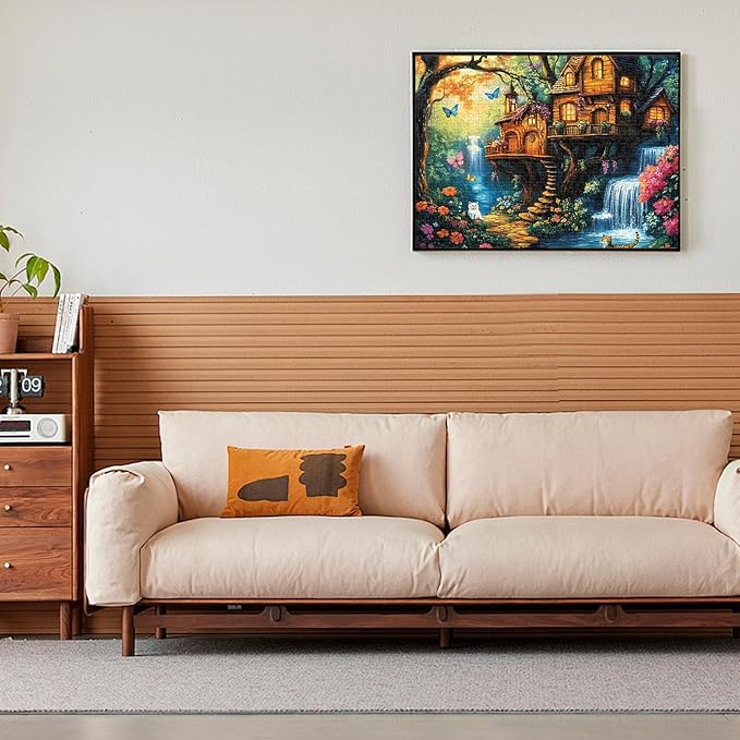 - Whimsical Treehouse & Nature Scene – This 500-piece jigsaw puzzle for adults features a magical treehouse, fluttering butterflies, flowing streams, blooming flowers, and playful cats. Perfect for puzzle lovers who seek a relaxing and colorful escape!
