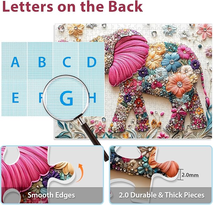 - 500-Piece Floral Elephant Puzzle for Adults – Immerse yourself in the intricate beauty of this stunning floral elephant puzzle, featuring delicate handcrafted flowers, sparkling crystals, and gemstones in soft pink, white, and teal shades. Designed for adults, this 500-piece puzzle comes with a bonus glare-free poster, making it the perfect addition to any puzzle lover’s collection. Packaged in an elegant gift-ready box, it’s the ultimate puzzle experience!