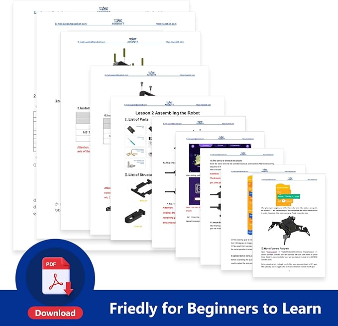 - Easy to Assemble - Using unified model screw splicing, installation and use are a breeze. A PDF tutorial with illustrations is considerately prepared for you, which teaches you to build your quadruped robot step by step. Structure building can exercise children's hands-on ability and cultivate children's interests and hobbies.