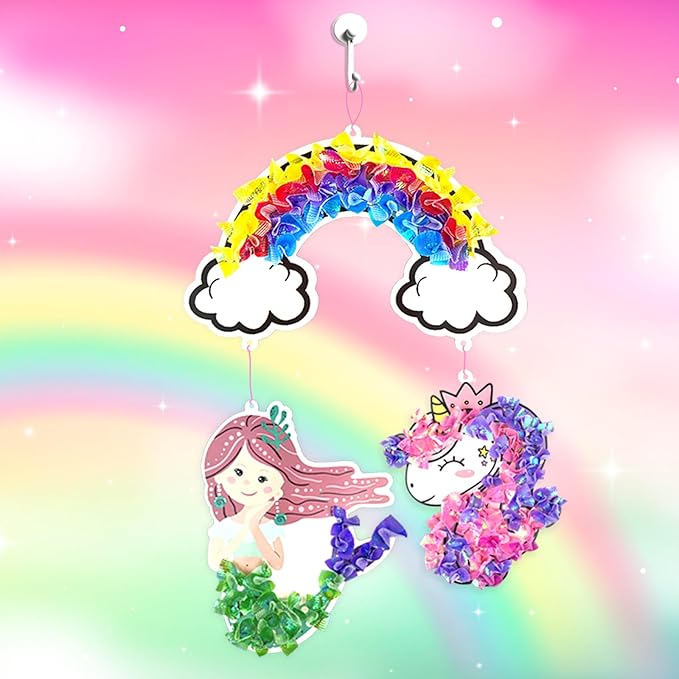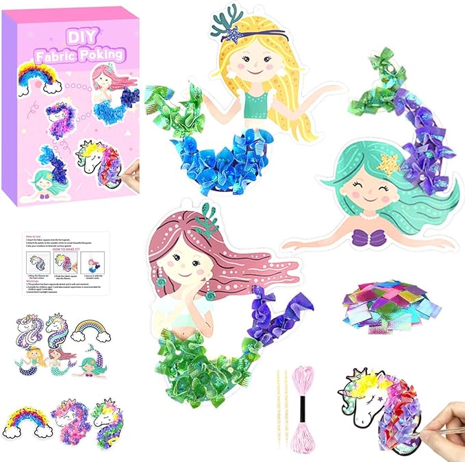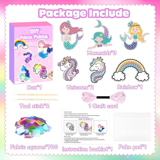 - 【 DIY Crafts kits for Kids 】This poke art and crafts kit includes 700 fabric squares, Mermaids*3,Unicorns*2,Rainbow*1,1Craft cord,2 poke-in sticks,a poke-in pad and an instruction manual.Poke art for kids ages 4-8 – perfect for developing early crafting skills