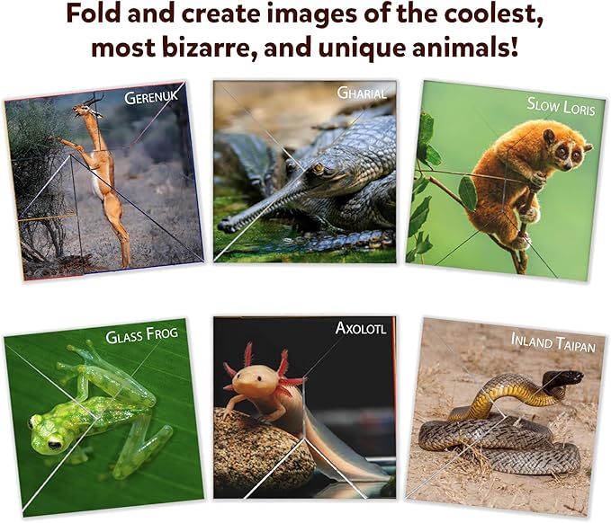 - ORIGAMI FOLDING PUZZLES: Get ready to fold and create images of some of the coolest, most bizarre, and unique animals around the world! Solve 48 origami puzzles across two levels of difficulty and enjoy the fun of hands-on play.